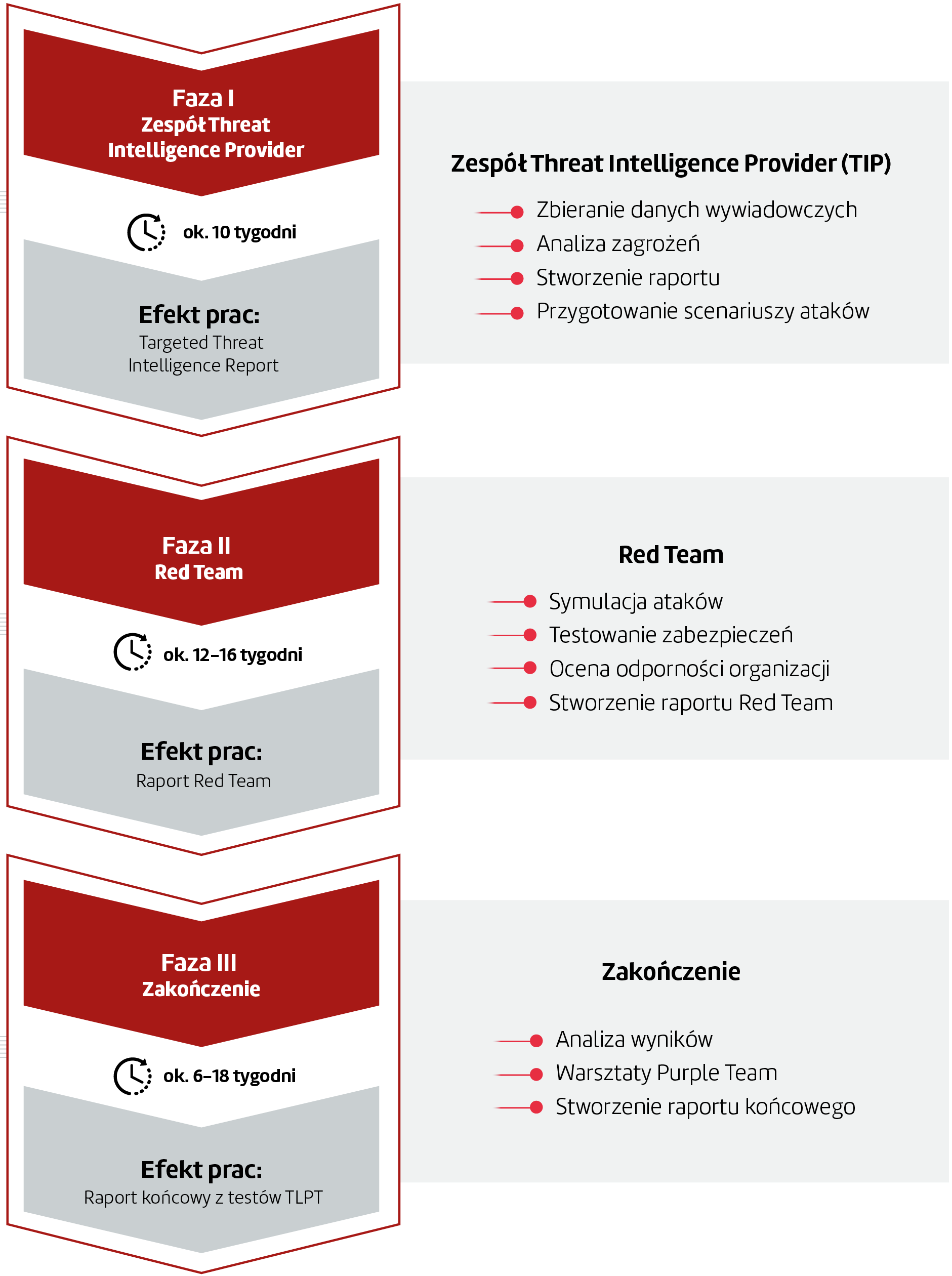 Długość trwania testów TLPT zależy od ustalonego zakresu audytu oraz złożoności obsługiwanego systemu, w porozumieniu z zamawiającą organizacją oraz organem nadzorującym. Rozporządzenie DORA przewiduje, że faza wywiadowcza będzie trwała ok. 10 tygodni, zaś faza Red Team – minimum 12 tygodni.